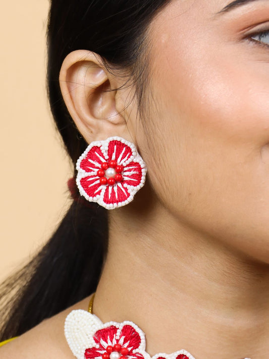 Flower Blossom Maangtika Earrings Set (Red-Yellow)