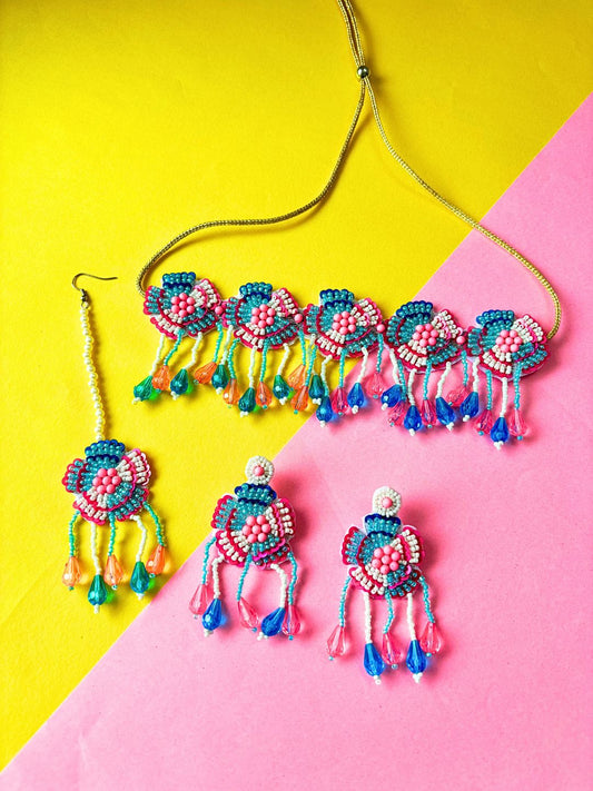 Flower Blossom Bridal Choker Maangtika Set (Pink and Blue)