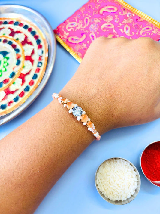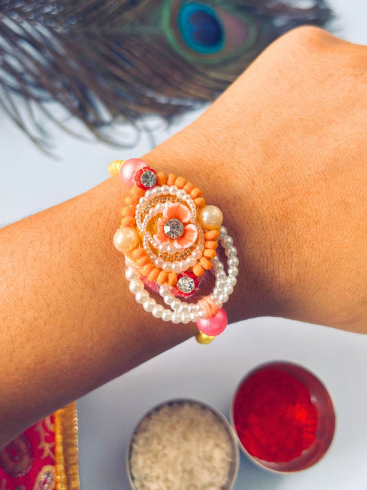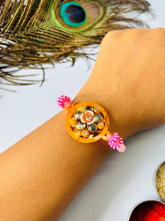 Orange AD Stone Rakhi with Roli Chawal for Brother