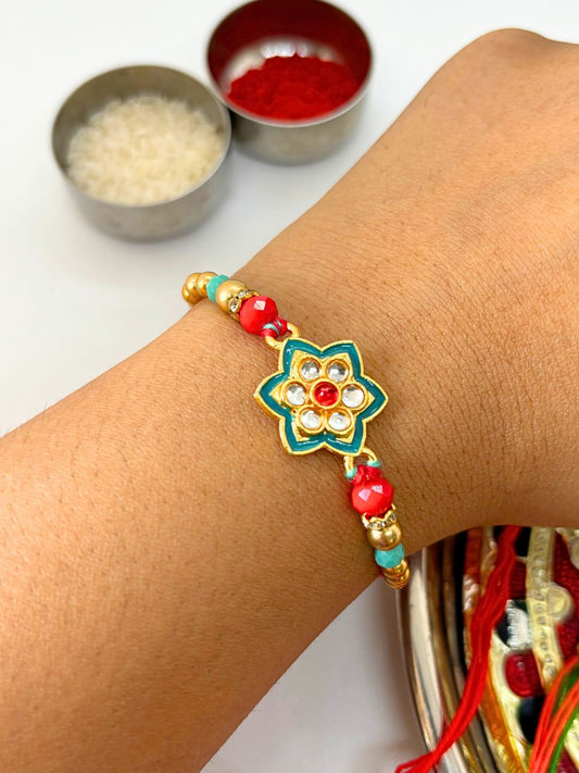 Traditional Kundan Rakhi with Roli Chawal for Brother - Flower Accent (Pack of 2)